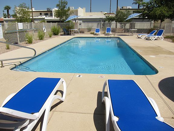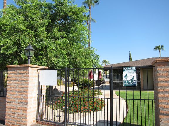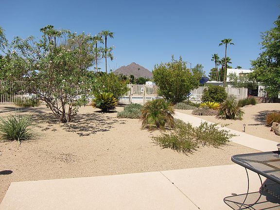 60s-era townhouse offers beehive fireplace and beamed ceiling in living room, two roomy bedrooms and two huge bathrooms. Storage galore including big walk-in closet, kitchen pantry and two storage rooms in garage. Charming saltillo-tiled patio is shaded by lush lemon tree. Community has its own small dog park. Close to shopping, restaurants and Chaparral Park. Owner pays HOA (which includes pool and lawn service); Tenant pays electricity, gas and water. Free Cox cable, phone, internet until March. One dog allowed. $200 pet deposit (refundable); $300 cleaning deposit (non-refundable).