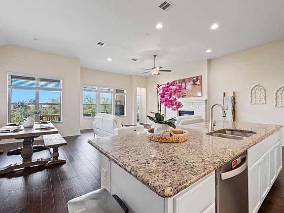 Stylish single-story in highly sought-after Lakeside at Tessera! Set on a lovely greenbelt lot with distant lake views, this beautifully upgraded home offers effortless living and refined style. Enjoy morning coffee or evening sunsets on the expansive covered patio with gas hookup and plenty of yard space. Sleek wood flooring throughout (no carpet!) The open-concept layout features a chef's kitchen with gas cooktop, granite counters, and a large island overlooking the light-filled living & dining areas. The primary suite includes a bay window and spa-inspired bath with upgraded finishes. Three spacious secondary bedrooms (one with an ensuite bath) PLUS a private study with French doors. Enjoy resort-style amenities lake access, pool, and picnic area all in a LEED Certified community! Refrigerator, washer & dryer included.