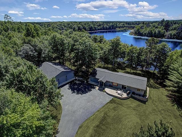 One fine design! This home shows like the designer home that it is. The home sports 2890 sq. ft of space! The kitchen is fabulous. From its ceramic tile floors to the cherry cabinets to the new appliances, you will love this space. The living area faces the water & features new carpet & beautifully finished walls. The master bedroom is large, airy, faces the lake and it too has beautiful new carpet & walls. The master bath is also well appointed and there is a walk-in closet. There is another bedroom on the main floor along with a first floor laundry & another half bath. In the lower level there is a huge family room that faces the water along with a bedroom & an office. There is also a full bath & a storage area. Outside you will find an oversized lakeside deck. You will also love the stone work of the patio. The driveway is paved & there is a 2 car att garage, a massive 40' x 48' garage and a shed. The yard offers 4.37 acres and over 300' of frontage and is nicely landscaped too!