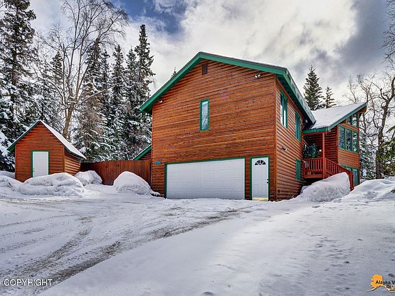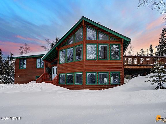 Attractive split-log exterior siding on this delightful prow-front hm that frames the city lights, inlet & Sleeping Lady on 1.16 acres of beautifully treed land.Open & airy LR w/cath clngs, kit w/mple cabs & tile flr! Beautiful hrdwd flrs. Lg mst ste w/ WI clst, sauna & sun rm w/hot tub. SW-facing BBQ deck off form dining. Fenced yrd, lg stor shed & exceptional RV pk. Definitely a drive-by!