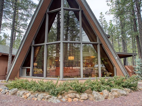 STUNNING.... A-Frame backing the National FOREST in the highly desired Pinetop Country Club. This cabin show TRUE pride of ownership! The wall of tall windows letting it tons of light & the vaulted great room with wood and beams is breathtaking. The open living area has a big wood burning stone fireplace and has an open type staircase to a loft area. The remodeled kitchen with the beamed ceiling is a DREAM and light and bright with SS appliances and a gas range. There are 3 decks & a outdoor lower patio area. The side and back deck plus the lower patio have breathtaking views of the peaceful forest that boasts beautiful tall Ponderosa Pines. The landscaping for this home is fantastic with flower and vegatable gardens with drip lines are beautifully placed throughout. Read 'more' If you are looking for a peaceful location - look no more. This home has lots of privacy and you will will bask in the whisper of the pines as you embrace the forest.