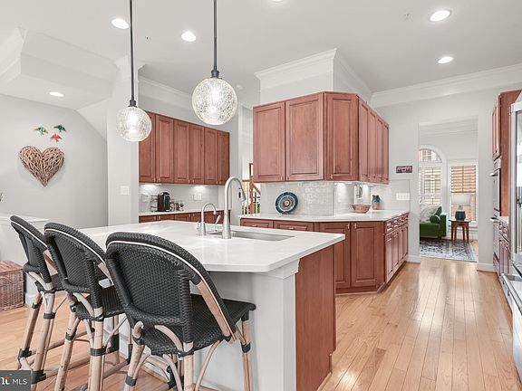 Stunning four level townhome, lovingly maintained by the original owners, located in the amenity rich Maple Lawn community. This beautiful Adams Morgan floorplan by Miller & Smith boasts over 3,500 sq. ft. of luxurious living space that includes a gourmet kitchen, an entry level bedroom and full bath, two family rooms, and a primary bedroom suite level with an office. This exceptional open floor plan offers a gourmet kitchen, dining area and family room highlighting a dual sided, gas fireplace, wood flooring, and accent molding, and a hideaway TV cabinet with Honeycomb Integrations surround sound system. You’ll love preparing your favorite meals in the gourmet kitchen offering 42 in. wood cabinetry, and updated with quartz countertops, subway tile backsplash, and stainless appliances that include a Café refrigerator and microwave, dual wall ovens, and a gas cooktop. There’s a bright and airy formal dining room, ideal for more intimate gatherings or optionally as a living area. Ascend the staircase to the primary bedroom suite level that includes an office, and a spacious bedroom with a sitting area and walk-in closet, and luxurious bath with a soaking tub, separate shower, and dual vanity. The top level has a huge loft, two bedrooms, and a full bath. Convenient entry level bedroom and full bath, and another family room through glass French doors, create the perfect guest suite. Fantastic outdoor living in the privacy fenced backyard on the stone patio highlighting a dual sided fireplace. Enjoy all of the vast array of amenities that Maple Lawn has to offer: sports courts, a swimming pool, club house, fitness room, and tot lots. Additional updates include a new water heater.