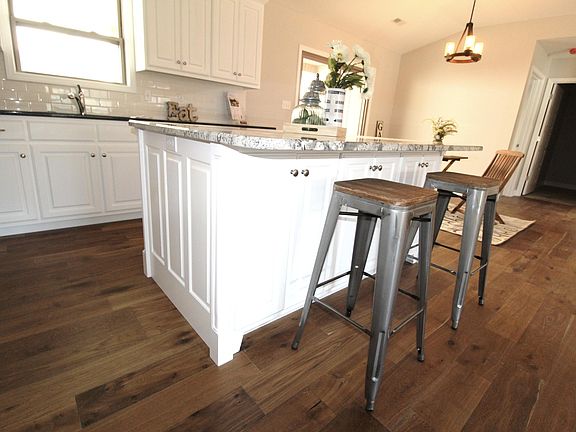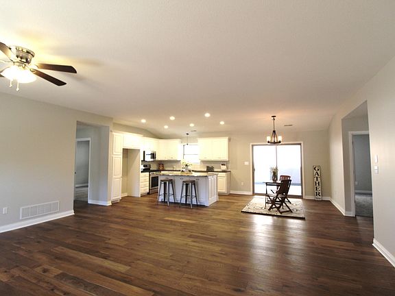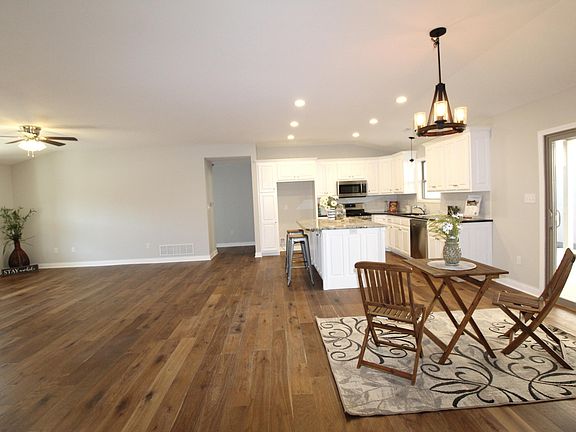 Main level living! The builder has finished plenty of storage room in this home with extra closets and a three car garage with a 12x20 storage room behind the garage. Open floor plan with hickory wood floors, custom white cabinets and island, granite, stainless appliances. Carpet in the bedrooms, tile in laundry room & baths. Master has tiled walk-in shower and a walk-in closet. Bedroom 2 has dbl closets. Covered patio off kitchen with extended patio. Very private and low maintenance.