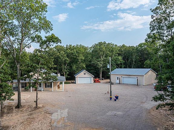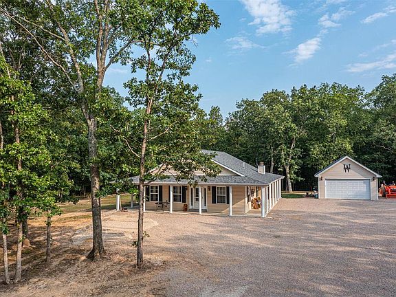 PRICED TO SELL! Serene setting, lovely ranch home on 5 acres with full covered wrap around porch is sure to please. 2 bed 2 bath ranch home, 30x40 outbuilding, 30x40 pad, detached 2 car garage. Step inside to open, light filled space. Inviting 6 ft wide hallway, spacious living/dining/kitchen area with room for everyone. Maple cabinets, center island, appliances stay, induction stove, dining area, bay window, atrium door to private back yard backs to trees. Laminate flooring, nice hall bath, master bedroom suite with walk in closet, bath, double vanity sink & shower. 2nd bedroom with walk in closet. Full walk out/up basement with, foam insulated ceiling, bath rough in, laundry area, washer & dryer stay. Detached 2 car garage, 30x40 insulated & sheet rock outbuilding is a perfect work shop, concrete floor, electric, work bench, cabinets & shelving, 30x40 concrete pad. Seller taking some of the cabinets marked, shelf & hanging air purifier. Desirable location!