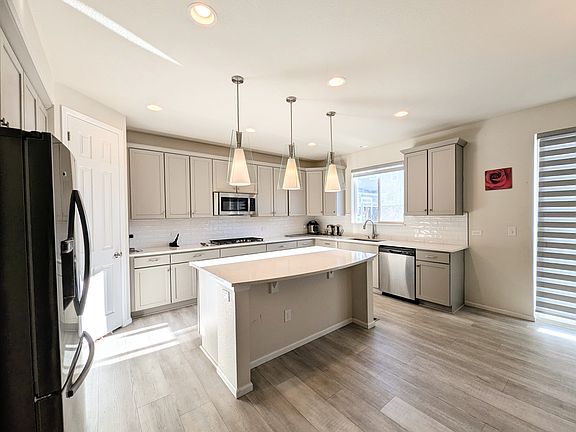 Available for rent this SUMMER is a stunning new single family home in awesome Colliers Hill Neighborhood. The main floor boasts LVP flooring throughout, a gourmet kitchen with high-end quartz countertops, stainless steel appliances and a bedroom with a full bath. The low-maintenance backyard includes artificial turf for reduced water bills and a raised concrete patio with a pergola, perfect for relaxation. The EXTRA LARGE 2.5 car garage, measuring 28 x 22.5 feet, offers additional storage space equivalent to one car's space. The home includes a full unfinished basement, providing ample storage space The upper level features a spacious loft ideal for an office or entertainment area, a large master bedroom with his and her closets and a five-piece bathroom, along with three more bedrooms, with a walk-in closet, and an additional full bath. The home comes with a refrigerator, washer, and dryer included. The community offers excellent amenities, including a clubhouse with a seasonal pool area, basketball and sand volleyball courts, playgrounds, and trails. There's also an exercise room available. Kids can easily walk to Soaring Heights K-8 and Erie High Schools. The Erie Rec Center and Library are just a 5-minute drive away, as well as restaurants, the Post Office, and shopping. The location allows for a short drive to either I-25 or 287 via Erie Parkway. Pets are welcome with a pet deposit, and the home is a non-smoking environment. Renters are responsible for Gas, Electric and water, HOA. Viewings are scheduled by appointment only. Kindly refrain from disturbing the current occupants. Renters are responsible for gas, electric and water, HOA, with a security deposit equal to one month's rent required. Small Pets are welcome with a pet deposit. Start date is negotiable.