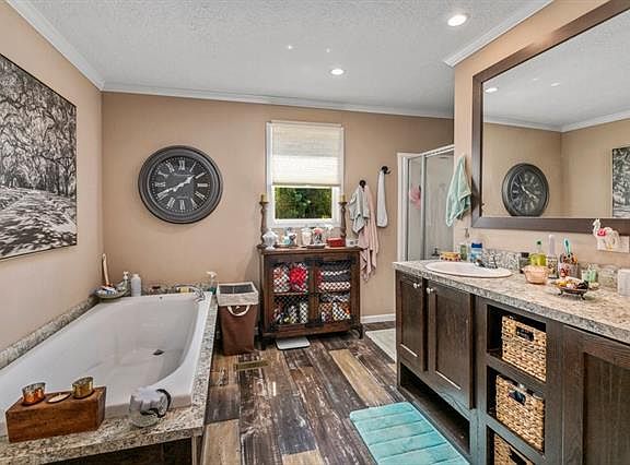 - Ceiling Fan(s), Kitchen Island, Pantry, Recessed Lighting, Laminate Counters, Built-in Features, Crown Molding, Open Floorplan, Shower, Bathtub, Shower in Tub