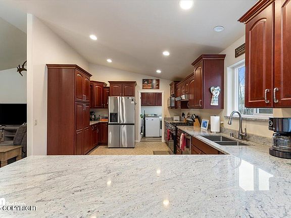 This home invites you to enjoy the charm of Alaska from the moment you walk in. Move in ready, with complete mother in law apartment or rental space, recently completed in 2025. Additional unit is accessible through a dedicated exterior entrance or interior stairwell. This home features 4 bedrooms, plus an office with closet, 3 bathrooms, 3456 sqft, a spacious 2 car garage...granite and quartz counter tops, soft close cabinets, LVP and tile flooring ,in-floor heat, gas grill rough in on back deck, trex decking, and fenced yard. Upstairs unit includes 2 bedrooms, an office with a closet, 2 full bathrooms, open living and dining with vaulted ceilings, oversized 2 car garage, laundry room, and access to the back deck and fenced in yard. Primary Bathroom features a soaker tub and stand up shower. Downstairs unit features arctic entry that leads to a mud room, thoughtfully laid out kitchen, dining, living room, 2 bedrooms, 1 full bathroom with double vanity, a large laundry room, and extra storage underneath the stairwell. This home is close to trails and Big Lake. Use the downstairs unit as a mother in law apartment, rental, or airbnb. Plenty of opportunity to bring in income and live upstairs comfortably or rent both units.