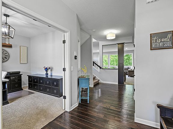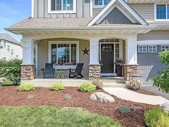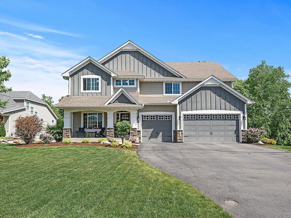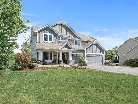Prepare to be amazed! The moment you walk in you will be delighted with the quality of finishes and unique touches. Gaze into great room and notice the floor to ceiling windows for natural lighting. A chef's gourmet kitchen w/large island, granite counter tops, stairless steel appliances, range, double ovens and double wide fridge/freezer! Three car custom garage w/ epoxy flooring, insulated, heated and slat walls to leave you speechless. The upper level includes 4 bedrooms, 2 en-suite, open loft, Jack n Jill bath and laundry! The lower level family room/home theater is perfect for movie nights and watching MN sports on your 120" screen. The wet bar is perfect for entertaining friends. You will absolutely love this floor plan! Walking distance to many restaurants, parks and PL High schools. Enjoy the secluded wooded lot and pond in your backyard. The pond provides free ice time for MN winters. This home features a front porch with a great yard. Don't miss this incredible opportunity!