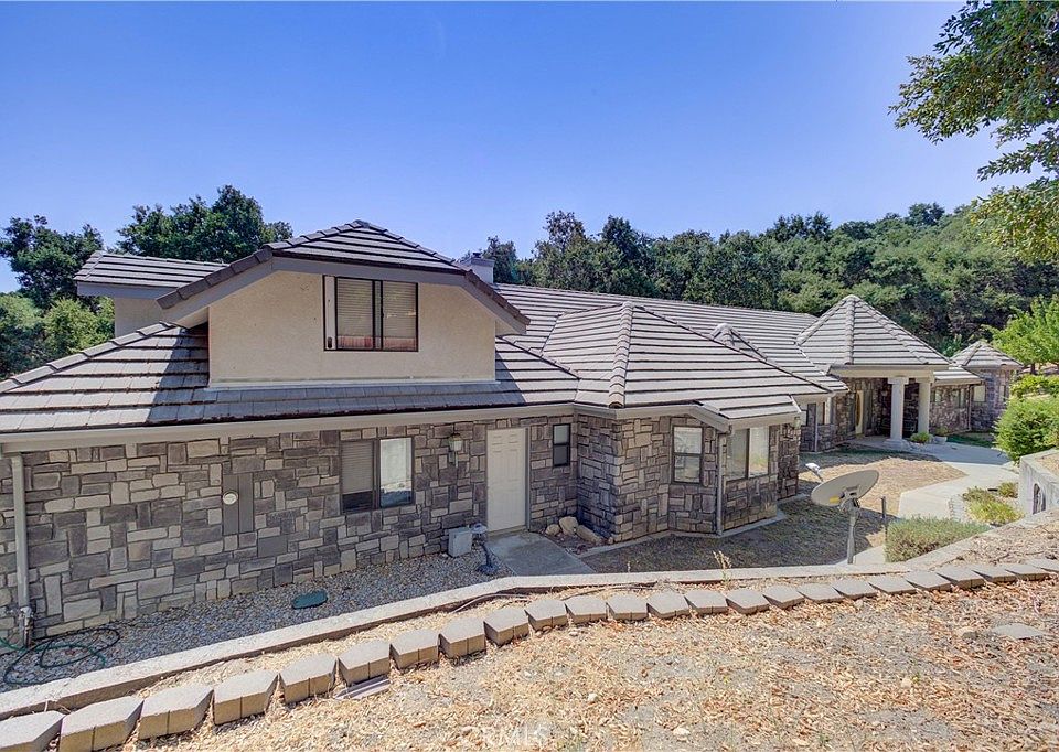 The home’s exterior is finished with durable cement tile roofing and cultured manufactured stone siding, providing both aesthetic appeal and long-lasting protection. Outbuildings on the property offer additional space for storage or hobbies.