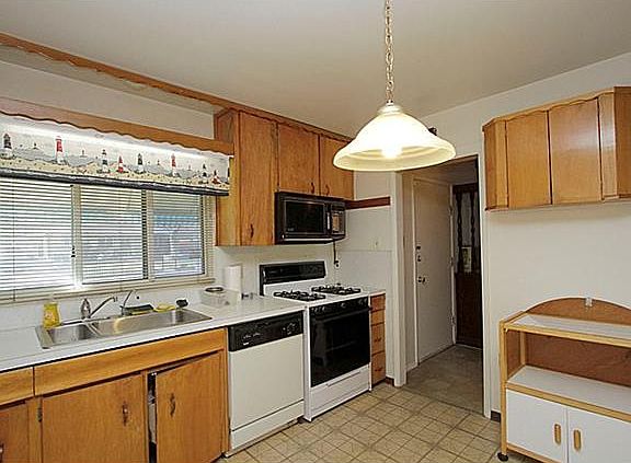 Charming split-level house- great architectural features! Beautiful natural wood vaulted ceiling! Wrought iron stair railing, original hardwood flooring throughout the house. 3-bedrooms in upper level with potential for 4th bedroom in lower level. Extra large laundry room with storage. Property had great potential to shine, cosmetic improvements will go a long way.