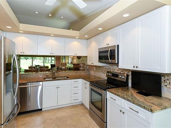 Soak in spectacular sunsets over gorgeous golf course and water views in this completely remodeled villa in desirable Club Villas @ Palm Aire. This is a dreamy sun filled maintenance free home combining the traditional with contemporary elements throughout. The home is blanketed with natural light, high ceilings, plantation shutters and the soft palette of well chosen upgrades makes decorating in your own personal style a breeze. The kitchen has been beautifully remodeled with high end white cabinetry, stone counters, SS appliances, gorgeous backsplash, and a side patio perfect for grilling. The master bath has been completely redesigned and remodeled with special touches and lovely finishes throughout while the guest bath has been handsomely updated. Large neutral tile floors combining both gray and brown hues are set on a diagonal throughout while both bedrooms are carpeted. New sliding glass doors and windows have been installed with impact glass along with an impact rated garage door. In 2020, the HVAC system was replaced with the added feature of ultraviolet light. The villa has also been repiped, custom closets built-ins added, recirculating hot water system added, and is completely move-in ready. Located within walking distance to the optional Palm Aire Country Club offering golf, tennis, pickle ball, and social memberships. Ideally located and so close to downtown Sarasota, SRQ Airport, UTC Mall, and all the amazing social activities Sarasota affords its residents. Low condo fees! Don't miss it!