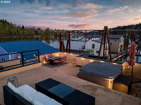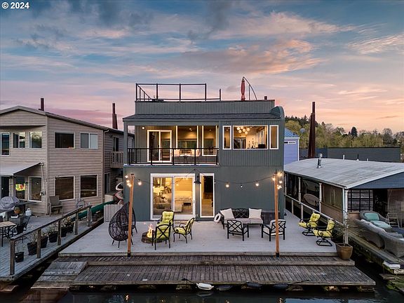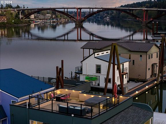 Spectacular, updated floating home in prestigious Macadam Bay Moorage with slip ownership included. The incredible natural light from the large windows on all sides adds to this stunning and unique home with a newer rooftop deck where you can enjoy all that the Willamette River has to offer. Being sold fully furnished! The main floor features two bedrooms, two bathrooms, and entry onto the lower entertaining deck. The second level features a cozy gas fireplace in the living room that opens to the updated modern kitchen with a built-in kitchen dinette. The rooftop deck has a spectacular 360-degree view of the river and the Sellwood Bridge. This home is move-in ready and ensures a seamless transition into your new riverfront lifestyle. Newer float with rating of 4. The property includes two reserved parking spaces in a secured, gated lot. The moorage offers garages on-site that are available for rent through a waiting list. The moorage is located between the Sellwood Bridge and Johns Landing and is conveniently close to Zupan's and many fantastic restaurants. You will have the best views of the many activities on the Willamette River throughout the year, like the 4th of July fireworks and the Christmas ship parade! New float with steel stringers. New HVAC in 2021 with AC! New roofing in 2019. Seller Financing Possible!