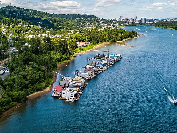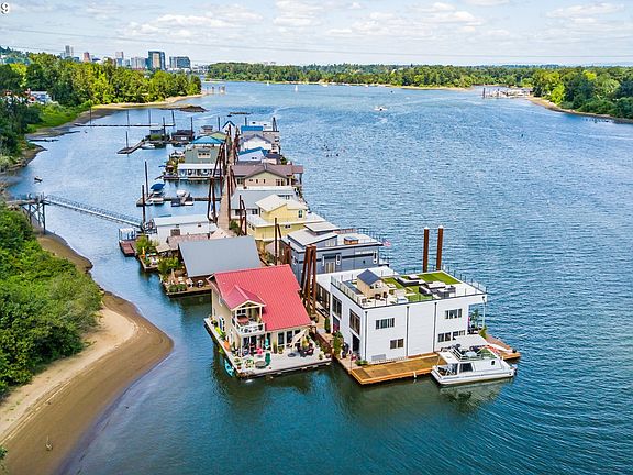 Recreational paradise! Spectacular end-unit architectural floating home offers panoramic views of the Willamette River from its lower deck and living room, balcony on upper floor of master bedroom with hot tub to soak in the sunsets, 3rd bedroom non conforming, fireworks and wildlife. Open concept floor plan, owned slip, tandem parking in gated community. Close to downtown, Lake Oswego and trail systems for year-round enjoyment.