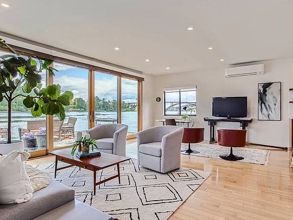 Float on the majestic Willamette River on this clean-line modern home in a private gated moorage. Offered as partially furnished or whatever works for you and your things. Enjoy magnificent sunrises and moonrises overlooking the stunning Sellwood Bridge and Park. Paddle with the eagles, walk across the bridge for top-notch markets, coffee shops, local restaurants and yoga studios. Or hop on the bike path to explore downtown Portland within 5 miles. Willamette Park is two blocks away with dog park and walking paths. A true sanctuary in nature with all the amenities of city life. A truly unique experience! Owner pays for water, garbage and HOA. Tenant pays for power, wifi and gas.