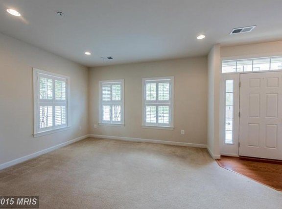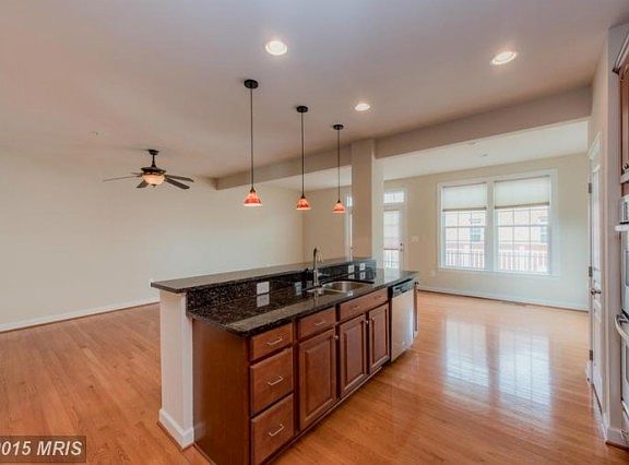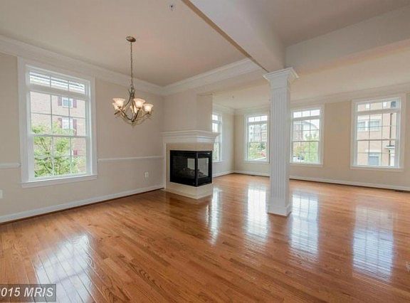 Stunning end unit townhome in Maple Lawn! Main level boasts rich hardwoods, formal living & dining rooms & 3-sided FP. KIT w/42" maple cabs w/crown trim, recessed lighting, SS appliances, tiered island w/raised breakfast bar & chic pendant lighting. Breakfast area w/sliding access the elevated deck. Owner's w/sitting room & lux bath. Entry level features a rec room & full bath. Welcome home!