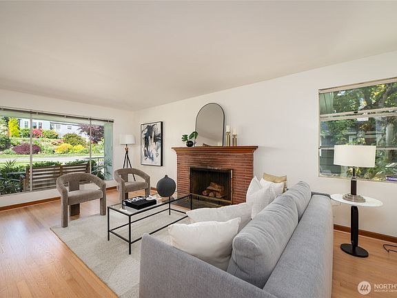 Charming 1940 Wedgwood home with covered front porch and classic appeal. Spacious living room features refinished hardwood floors and a brick wood-burning fireplace. Light-filled dining room connects to a bright kitchen with ample cabinets, breakfast nook, glass block side light, and access to covered porch. Main floor offers two bedrooms with hardwoods and full bath with ceramic tile floors. Daylight lower level includes kitchenette space, dining area, bedroom/family room with built-ins, sitting area, ¾ bath, laundry, and bonus room/office. Private, fenced backyard with lush lawn, mature landscaping, and garden patio. Large one car garage with work space. Prime location near parks, schools, cafés, shops, and transit. Don’t miss this Gem!