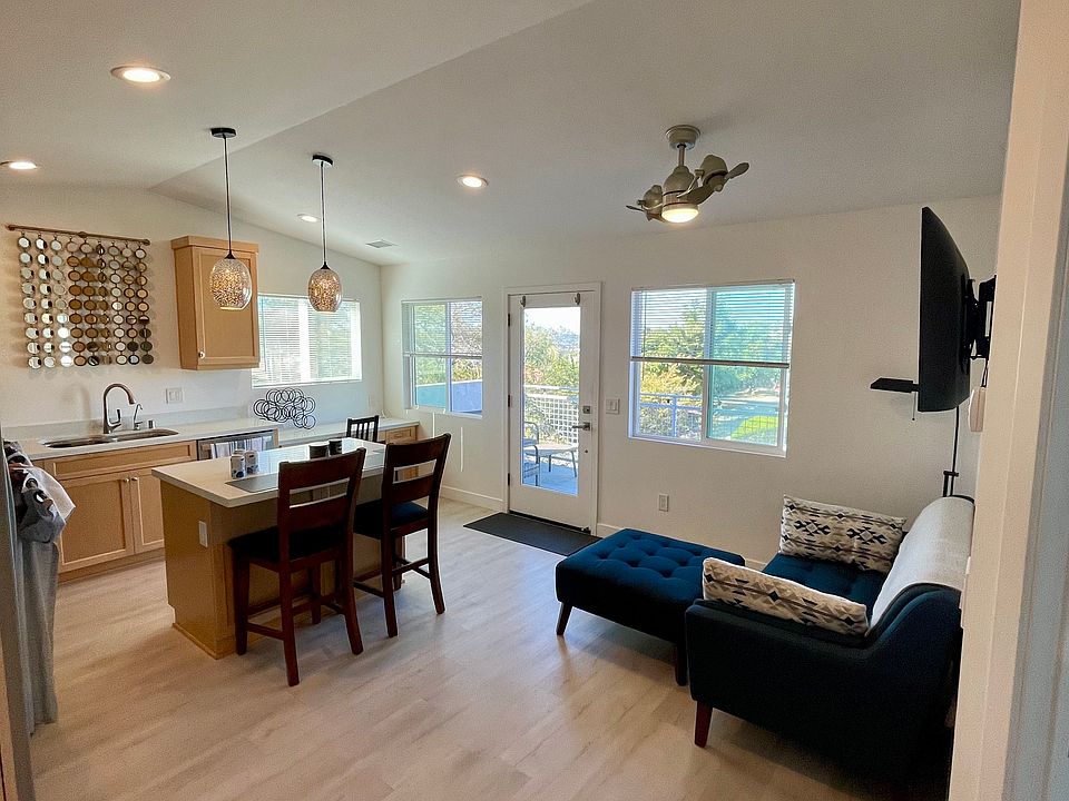 Discover your new home in this inviting upstairs furnished ADU! Abundant with natural light and bright and welcoming atmosphere, this 1-bedroom, 1-office, 1-bath unit offers 655 sq. ft. of comfortable living space. It features: One comfy bedroom One office with vaulted ceiling and view Modern bathroom Open-concept living area Well-equipped kitchen Water filtration system Stylish ceiling fans and light fixtures High end en-suite washer and dryer Quiet residential cul-de-sac location Enjoy outdoor living on the expansive 200 sq. ft. private balcony- perfect for relaxing or outdoor dining. This unit is ideal for those seeking a peaceful and convenient space with all the essentials. Minimum 6 month lease; fully furnished including linens and equipped kitchen; one off street parking spot; no pets or parties; includes all utilities. $150 one time cleaning fee due at lease signing.