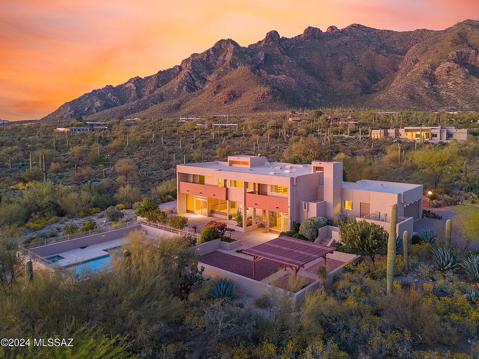 Nestled in the Catalina Foothills, architecturally significant one owner home by noted architect Earl Kai Chann on a 4.9 acre lot. Private gated driveway leads to a lovely front walkway occasionally visited by a pair of big horned owls. House set to capture mountain scenery, city views; spectacular Arizona sunsets from porches/patios throughout. Mid-century design elements enhance the entrances; the gathering spaces in the living, dining, breakfast, family rooms, offer an open airy flow. Spacious laundry room; plentiful storage space a plus. Built-ins, fireplace, wet bar, easy access to poolside enrich the family room. The pool, spa, ramada echo the defined shapes of the home. Zoned for horses. Neighborhood convenient to UofA, downtown, Pima Canyon.