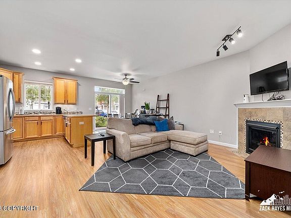 Beautiful townhome with open dining/living/kitchen, pantry, gas FP, 9''ceilings, SS appliances, 42''cabinets on lower level. All bedrooms are on the upper level: 2 bedrooms w/full bath and a lovely main ensuite w/ WIC, vaulted ceiling and mountain view. Paved walkways, landscaping and convenient location to shopping, dining, JBER, etc. Wonderful place to call home!