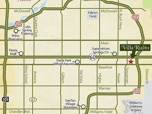 Villa Rialto Condominiums is Mesas best value! 2 and 3-Bedrooms luxury condominiums located within a gated community, featuring a heated pool, fitness center and lush, green grounds. Each home has its own direct-access, private garage as well as features that most builder will charge extra for! Our homes all include 9 ft ceilings with satin nickel fans in all rooms, stylish granite countertops, 42 maple cabinets with choice of hardware, Whirlpool stainless appliances- all standard!Downstairs homes have walk-out, enclosed patios while upstairs residences have walk-out balconies. Youll be impressed with the design, floor plans and finishes at Villa Rialto!Most of all, well make owning your new condominium a breeze. We have all financing programs including FHA, VA and conventional and even zero-sown payment loans too! In a lease now but wish to move? Well pay your early lease-termination fees in many instances. Just ask us!Move-in ready spec homes can be seen every day. We have just the right home for you! No hassle, no pressurejust good, solid information. Visit or call us at your convenience.