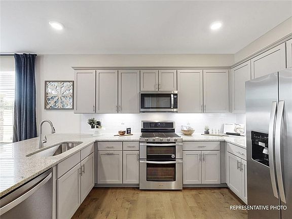 Up to $10,000 in closing costs through our preferred lender. Move in Package: washer, dryer, refrigerator, and blinds installed. Open floor design. 2 story, 3 bed, 2.5bath, 2 car rear-load garage. All bedrooms have a walk-in closet and the primary has two. Kitchen features stainless steel appliances including dishwasher, 5 burner gas range, and microwave. Granite countertops with tile backsplash, undercabinet lighting, hidden trash/recycling bin, breakfast bar, and designer inspired Giana Gray cabinet package complete the kitchen.