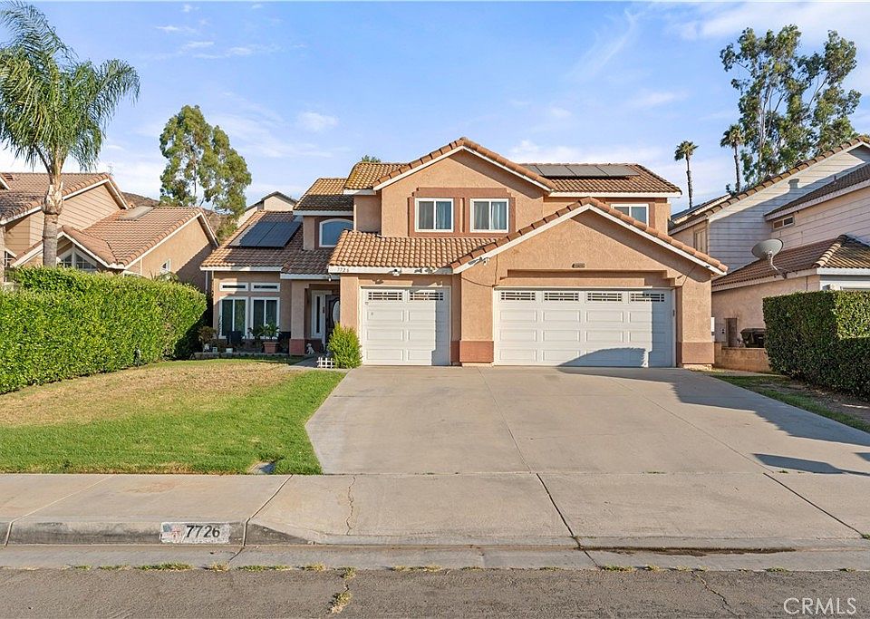 Welcome to this beautiful two-story, 5-bedroom, 2.5-bath home situated on a spacious 8,712 sq ft lot in one of Jurupa Valley's most sought-after neighborhoods. Offering 2270 sq ft of living space, this property blends comfort, excitement, and curb appeal. Step into this bright and inviting home, where soaring ceilings and abundant natural light create an airy, open feel from the moment you walk in. As you enter the kitchen you will notice that it's well-equipped with granite counter tops, stainless steel sink and stainless-steel appliances, a wine fridge and lots of cabinet space with a beautiful view of the sparkling pool and spa. The home offers a convenient laundry room, a half bath and a full bedroom on the the main floor. The spacious living area with modern tile flooring, anchored by a charming brick fireplace for relaxing and enjoying those special moments. As you go up the stairs, the bedrooms provide privacy and relaxation. Other notable features include the NEW AC, NEW dual pane windows, New pump for pool, NEW water heater, and best of all 25 paid off solar panels providing you with free electricity throughout the year. Conveniently located in proximity to freeways, schools, parks, shopping, and the list goes on. This home is ideal for entertaining and everyday life.