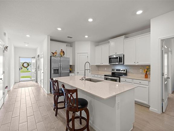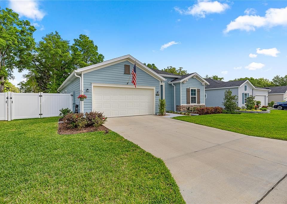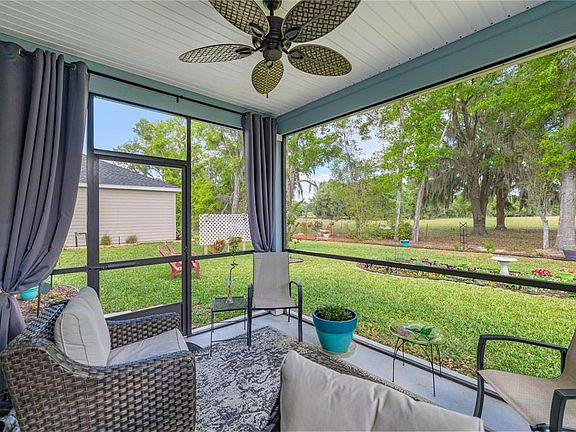 Move-in ready and better than new! Built in 2023 and meticulously maintained, this stunning home offers modern design, comfort, and convenience in a prime location. Tile flooring flows through the main living areas, while plush carpeting adds warmth to the bedrooms. The open-concept kitchen is a showstopper, featuring white shaker cabinets, granite countertops, a large center island, ample workspace, and a spacious pantry—perfect for everyday living and entertaining. The bright living area is filled with natural light, creating an inviting space to relax or host guests. French doors open to a private den, ideal for a home office, media room, or guest space. The spacious primary suite boasts a walk-in closet and a luxurious ensuite with double vanities and a beautifully tiled walk-in shower. A generously sized secondary bedroom and stylish guest bath offer comfort and privacy for visitors. Enjoy peaceful outdoor living on the large screened-in lanai overlooking the landscaped, partially fenced backyard with charming flower beds and serene views of neighboring farm animals. The community features a sparkling pool and is conveniently located near On Top of the World, Stone Creek, shopping, dining, medical facilities, and entertainment. Homes like this don’t last—schedule your private showing today!