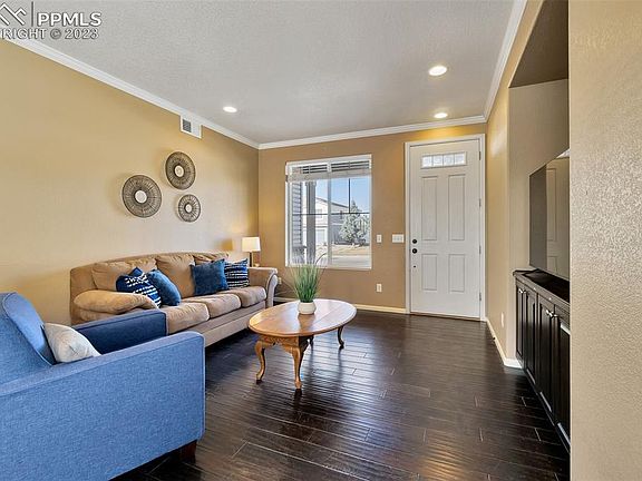 Welcome home to this gorgeous opportunity in Cumberland Green. This home is situated within walking distance of an open space, playground and disc golf course. Close proximity to I-25 and powers corridors plus all the new amenities being added on Mesa Ridge Parkway and Fountain. The home itself features a beautiful open floor plan from the moment you walk in. Tall ceilings, can lighting and crown molding only add to the cozy and spacious feeling of the home. The kitchen features large cabinets, a beautiful modern backsplash styling and stainless steel appliances. The upstairs features a beautiful rod iron stairwell leading to an open style landing that connects to a large multi-purpose loft. There are 3 bedrooms on the upper level. The primary suite is sure to impress as it easily fits a king size bed, plus a lot of storage with the walk in closet. This home also features a recently installed Whole home water filtration system PLUS fully installed and ready to go Solar panels.
