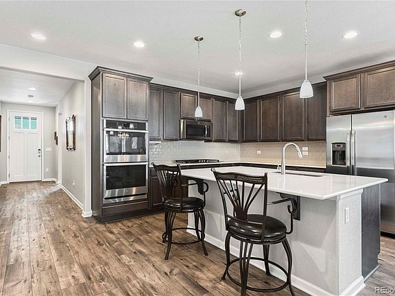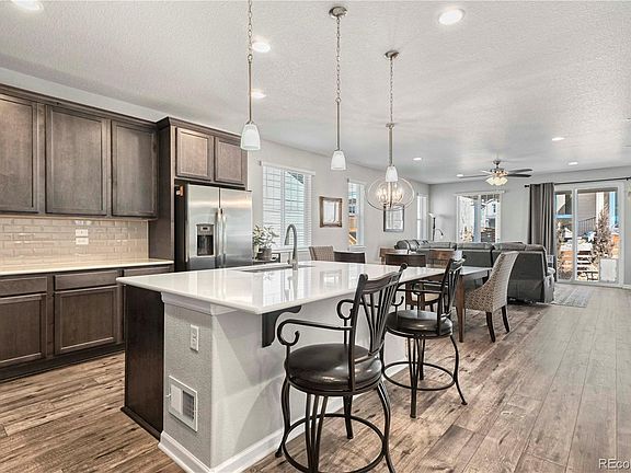 Fantastic Ranch with finished basement and mountain views in the desirable Colliers Hill neighborhood! No need to wait for new construction with the turnkey ready home featuring smart home appliances and professional upgrades throughout. The luxury wide plank flooring extends throughout the main floor living area, brining you into the open great room with upgraded lighting fixtures, tile surround gas fireplace with mantle and access to the back patio. Great option for entertaining with this open floorplan flowing into the beautiful gourmet kitchen featuring a large center island with room for eating, upgraded pendant lighting, tile backsplash, 5 burner gas cooktop and double oven. The primary suite offers true relaxation with a private 5pc bath featuring a large Quartz soaking tub, extended counter with dual sinks and walk-in shower. The functional main floor living space continues with a full bathroom, two bedrooms and laundry room with washer and dryer included. Space is not an issue with this home! The professionally finished basement provides a huge Rec Room perfect for entertainment, game room and additional family room. The basement also offers two additional bedrooms and bathroom making it a perfect option for guests! The three-car garage and extra driveway space provide plenty of guest parking. Enjoy beautiful sunsets and mountain views from your front patio while connecting with the great community that has tons of activities year round with the well maintained HOA giving you access to the Clubhouse, Pool and several parks, playgrounds and trails! Fantastic location, close to downtown Erie which provides plenty of shopping and restaurants for entertainment and easy access to major routes providing a convenient commute to Denver, Boulder and DIA. This home really brings it all together with upgrades, space, functionality, and location! Don’t miss out!