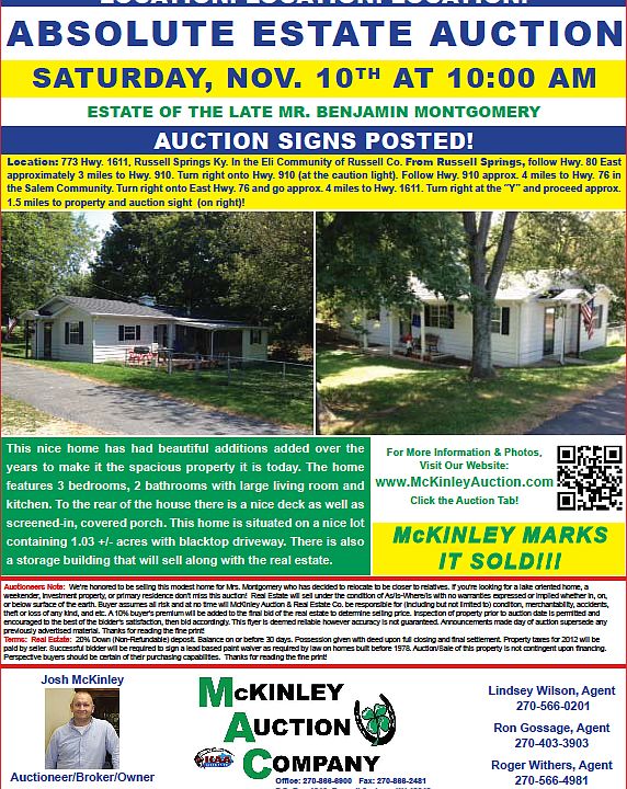 Absolute Auction Saturday November 10th at 10:00 AM. Selling this property to the highest bidder. Located only minutes to Lake Cumberland. Log onto www.McKinleyAuction.com for more information or call 270-866-6900
