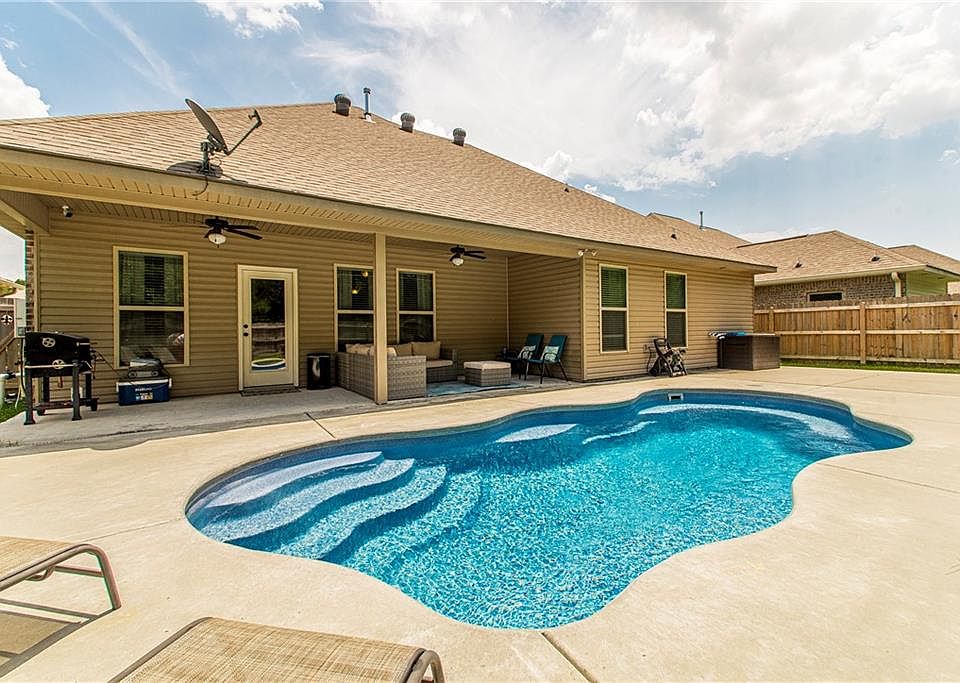 WELCOME HOME!! This beautiful 4 bed/2 bath, energy efficent home is a must see! The open floorpan boasts with tons of natural lighting, quartz countertops throughout, wood plank tile in the living room/wet areas, a fireplace, real wood cabinetry, a walk in pantry, and MORE!! The primary bath offers separate tub/shower, his/her sinks, and an oversized closet. The fully fenced backyard features a covered patio and an inground swimming pool. Flood zone X. Call today to schedule your showing!!