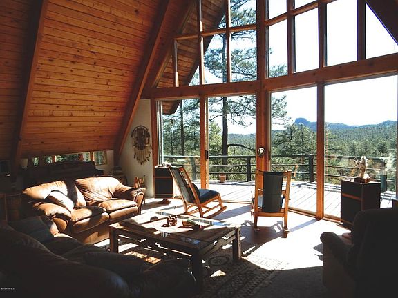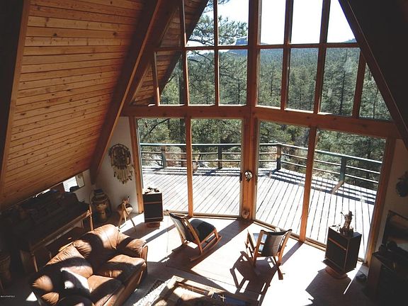Million Dollar Views of Mountains, Prescott National Forest, & Thumb Butte. Spacious A-Frame design: Light & Bright w/vaulted knotty pine tongue & grove ceilings. Additional 1100 square feet of wrap around decking for outdoor living & entertaining. 92% efficient furnace & wood-burning stove. Level entry; Open floor plan & Great Room on main level w/2bds & full bath. Upstairs master suite, sitting area/loft & sundeck/balcony. Quiet, private & just breathtaking retreat like qualities. Incredible stargazing! Potential for 1000sf building space below. A negotiable $5,000 credit to Buyer for Flooring is available. Don't miss this rare opportunity for your Prescott forest retreat!