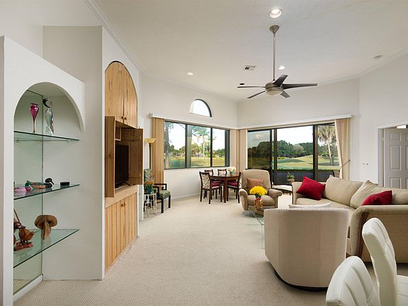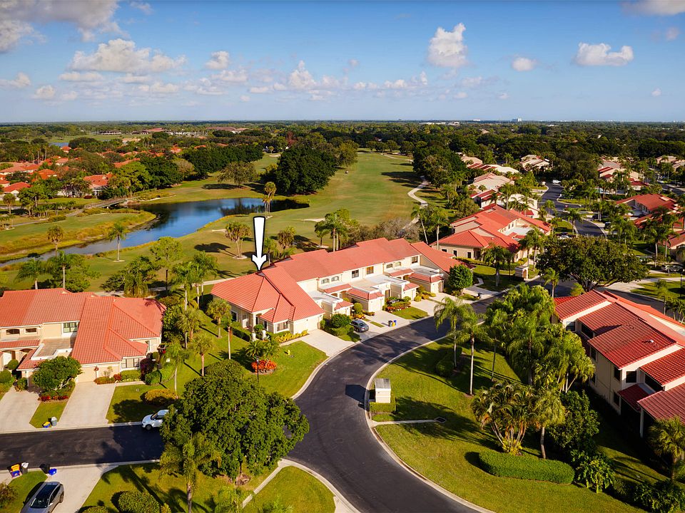Set along the picturesque fairways of PGA National, this beautifully maintained single-story townhouse offers an inviting blend of comfort, style, and effortless indoor-outdoor living. Bright and airy with high ceilings and abundant natural light, the open-concept living and dining areas flow seamlessly to a covered, screened patio overlooking the golf course and tranquil lake beyond--an ideal setting for morning coffee or evening relaxation. The kitchen features crisp white cabinetry, marble-look quartz countertops, and a sleek glass subway tile backsplash, along with a convenient snack bar perfect for casual dining or entertaining. A flexible den/office provides an additional living space that can easily serve as a third bedroom. The spacious primary suite is a peaceful retreat, enhanced by high ceilings, warm white oak laminate flooring, a walk-in closet, and sliding doors that open directly to the patio. The renovated en-suite bathroom offers a spa-inspired feel with modern vanities, quartz surfaces, and a beautifully appointed glass-enclosed shower. Additional conveniences include full hurricane protection with accordion shutters and impact windows, plus an extra refrigerator in the garage. With immediate golf course access and sweeping lake views, this residence offers the quintessential PGA National lifestyle in a quiet, sought-after community.