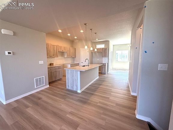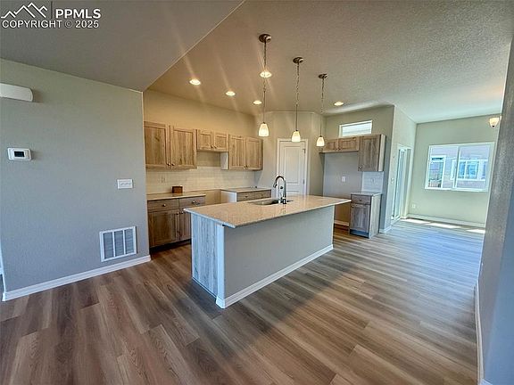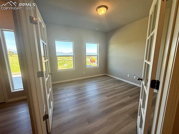 Looking for great mountain views? This spacious 3-story home delivers just that—with unobstructed views of Pikes Peak and the Front Range from the flex room, the living room and the primary suite. The entry level offers that flexible bonus room—perfect for a home office, gym, or playroom—plus a powder room and a 2-car garage. On the main floor, the open-concept kitchen, 9 foot ceilings, dining area, and living room create a bright, welcoming space for everyday living or entertaining. Upstairs, the primary suite includes a walk-in closet, while two additional bedrooms and a full bath complete the top level. It’s a thoughtful layout with comfort, luxury, convenience, and Colorado scenery in mind.