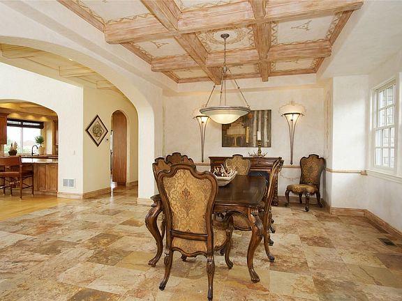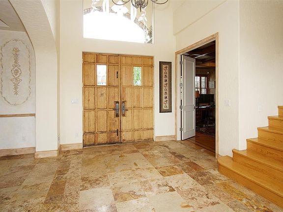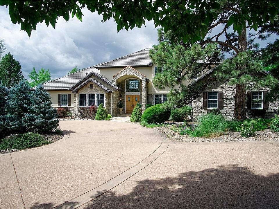A French country home featuring an open and airy floorplan, Front Range and Pikes Peak views from every major room. This 7000 square foot home is designed for entertainers and the Colorado lifestyle! An impressive stone entrance and 1850's double church doors welcome you and your guests into the home. Step into the travertine entry and be wowed by the two story glass windows and views! French doors lead outside to a 1,000 square foot deck. Above the great room, a bridge leads to 2 bedrooms, a bath, and flex space perfect for an upstairs office or music room. 2 master suites each with a sitting room. A main floor master features a fireplace and coffee bar. Recent renovations include the addition of a new fitness center which add approx 300sq feet more finish, gourmet kitchen, refinished deck/dry below system, Juliet balcony, exterior paint, windows (80%), french doors, gutters, Hunter Douglas solar shades/woven blinds, etc... totaling over $400K in upgrades. A must see!