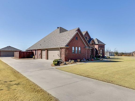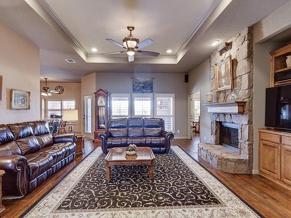 Impressive 1 story stone & brick home tucked on 1 acre with 4 beds, 2.5 baths, 2 living areas, a 3-car attached garage & a 35x30 workshop-garage with overhead doors for addtl parking or to use to suit your needs. Allergy friendly with NO carpet. Stunning wood floors & oversize upscale tile thru. Bed 4 with French doors off of foyer makes great home gym or study. Family room with stone fireplace & built-ins. Island kitchen with granite counters, smooth ctop, custom cabinets & stainless appliances. Split beds. Master with jetted tub, separate huge walk-in tiled shower, dual vessel style sinks and walk-in closet. Covered patio with brick fireplace overlooks acreage with 22 trees, 18 colorful crepe myrtles.