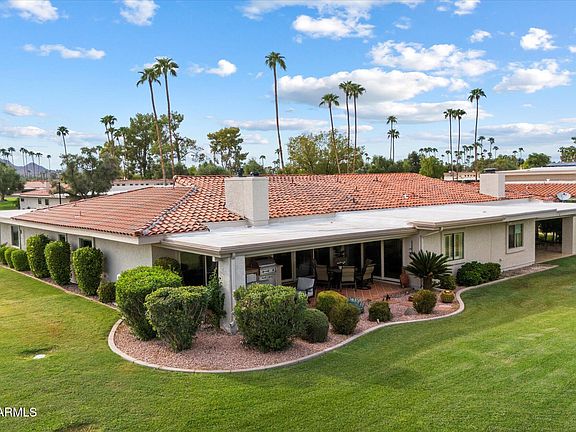 Enjoy spectacular mountain, lake and golf course views from this zero-step, McCormick Ranch home located in sought after Sandpiper, known for its open green spaces and natural beauty! Enter the light-filled courtyard to a spacious great room with a stone fireplace and an updated kitchen complete with gleaming Bosch appliances and sparkling quartzite counters, perfect for entertaining. The split floor plan offers privacy and versatility, boasting an office and three large bedrooms. The primary suite offers a spa-like updated bathroom and a large walk-in closet with ample storage. Step outside to sweeping mountain and golf course views and a built-in grill and refrigerator. Enjoy a 2024 HVAC, 2022 roof, access to 7 pools and a 24-7 guarded gate. Welcome to the best of Scottsdale living!