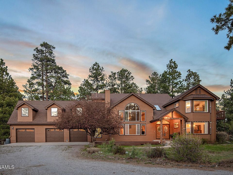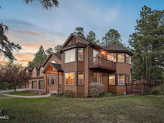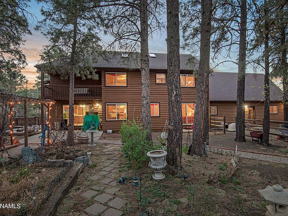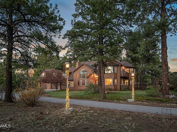 Welcome to your very own private mountain retreat. A place to relax and unwind. Only a few minutes outside of town, this 4035sqft home sits on 4.37 acres full of ponderosa pine trees and the most stunning views of the San Francisco Peaks. The property has no HOA, and allows for short term rentals. The 6 bedrooms leave plenty of space for a growing family or a gathering of guests. No restrictions provides the luxury of keeping horses, farm animals, or whatever your heart desires. The estate allows for an additional dwelling unit to be built up to 1000sqft! As you enter the home, you are greeted with high vaulted cathedral ceilings and huge chalet style windows looking out to trees and mountain views. The open concept gives plenty of space to entertain, relax, an enjoy. Come and see today!