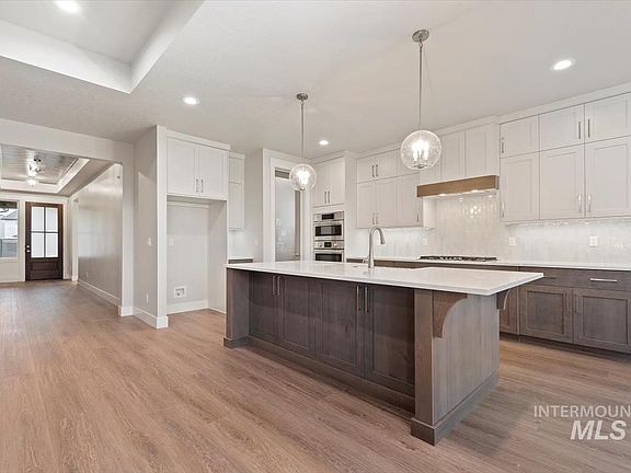 Ask about our $20,000 Builder INCENTIVE! Welcome to The Camas – a stunning single-level home that perfectly blends thoughtful design, modern luxury, & exceptional craftsmanship. Positioned on a desirable corner lot, this residence enjoys added privacy & a striking brick-accented exterior that enhances its curb appeal. Inside a coffered entry ceiling sets the tone, while durable & stylish LVP flooring leads you through the home’s inviting spaces & a desirable split-bedroom layout ensures both comfort and functionality. At the heart of the home, the gourmet kitchen is as beautiful as it is functional—featuring custom soft-close cabinetry w/ under-cabinet lighting, a spacious island with a farmhouse sink, stainless steel Bosch appliances, & a walk-in pantry. The primary suite is a luxurious retreat, complete with a spa-inspired bath featuring a zero-entry curbless tiled shower, a freestanding soaking tub, and a generous walk-in closet. With full landscaping, fencing, and sprinklers already in place, this home is as practical as it is beautiful—ready for you to simply move in and enjoy. Located in Inspirado, residents will experience the best of Treasure Valley living - Enjoy panoramic views of the Boise Foothills & an exceptional array of amenities including a custom clubhouse, pool, & pickleball courts, & walking paths for a vibrant, active lifestyle.
