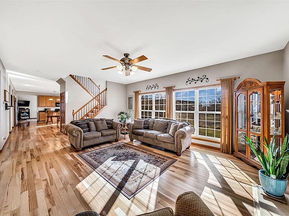 This home was designed with space in mind & includes tall 9' ceilings & wonderful views of the neighborhood lake from many rooms. Spacious kitchen features quartz counters, 42" upper cabinets & roll-out trays in the lower cabinets, breakfast bar island, butler's pantry & huge walk-in pantry. Bonus room tucked in back makes a handy office or playroom. Relax in the great room w/gas fireplace or the upstairs loft. Luxurious primary suite has a large sitting room area, private bath, & enormous 13'x12' walk-in closet. Each generously-sized bedroom has its own private bath access & walk-in closet. Big 3-car garage & large landing room/laundry w/utility sink, closet & cabinet storage. Walk-out lower level w/roughed-in & framed bath. Dual, zoned HVAC. Fully fenced, irrigated, level yard backing to the peaceful lake w/deck & patio. Quaint neighborhood of 95 homes w/private streets close to shopping, dining & entertainment w/easy access to I-64/364. Wentzville (Liberty) Schools. See it today!