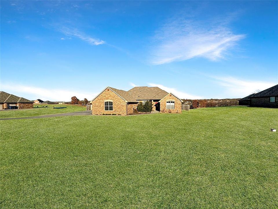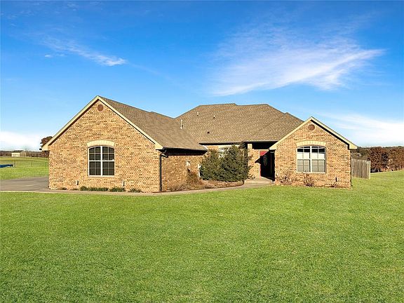 This welcoming four-bedroom home (plus an additional study) is the perfect blend of rural charm and urban convenience in the serene Deerfield West Addition. It's just a short commute to Tinker from the 1-acre (mol) property! The home features a kitchen designed to impress, complete with granite countertops, a sizeable pantry, island, and useful built-ins. The primary suite is a haven with a large jetted tub, expansive shower, and dual vanities, all leading to an extravagant wrap-around closet with built-in cabinets. Step outside onto the covered patio to enjoy serene evenings, lively weekend BBQs with friends, and beautiful sunrises. There’s also a 3-car side garage with double gate backyard access for your convenience. Enjoy the self-reliance of well water and a septic system. Plus, with multiple options for high-speed internet, you can telecommute or stream with ease, making this the ideal spot to balance work and play. Home also has a brand new roof!