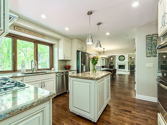 OPEN HOUSE 8/27 1pm-3pm. Over $150k in upgrades in this 4200sqft, Bob Webb built home. New wood flooring,new kitchen cabinets/granite/appliances,two new gas fireplaces,heated floors in BOTH upstairs bathrooms,new front walkway and landscaping,new exterior doors and skylights,and 2 new 6x5 picture windows. Beautiful coffered ceilings and new fireplace woodwork added in the great room. Huge walk out basement can be used for office or mother-in-law suite, with plenty of room to spare for a rec room. Large windows throughout (including basement) and 4 skylights give plenty of natural light. Private wooded lot and multi-level deck is an entertainer's dream. This ravine oasis sits on a quiet street. Walking distance to park & open field. Convenient Location!