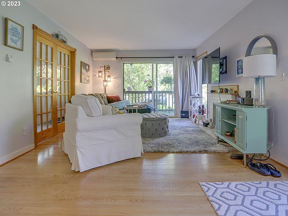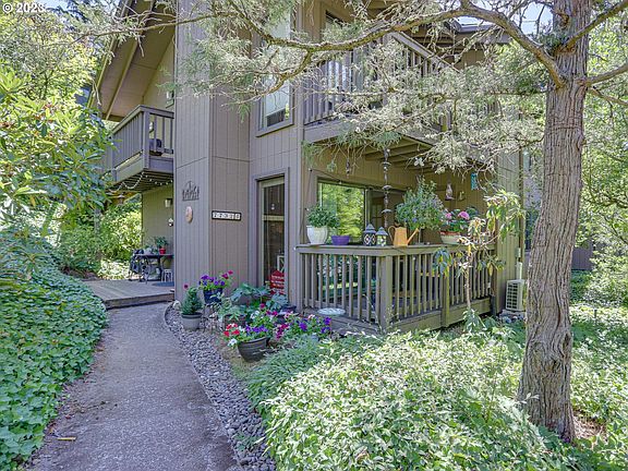 Sylvan Heights stunner providing ground level access and close proximity to shopping, OHSU and public transit! This cozy home provides a patio in front and deck located off a slider with storage closet. 812 sq ft of living space includes in unit washer and dryer, mini split heat pump, bar seating in the kitchen that transitions to an adjoining dining room. Solid wood floors abound in this corner condo with views from the living space which also offers a cozy fireplace. Step through double French doors into the second bedroom that could function perfectly as an in home office space. Sylvan Heights is a forested condominium community nestled in the West Hills and includes common spaces featuring three tennis courts, and a recreation center that provides free wifi and a kitchen and a fitness room, spa, pool, and a private nature trail. This won't last long!