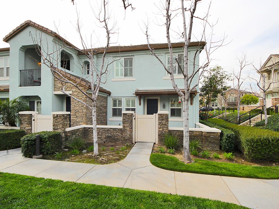 Gorgeous contemporary condo in the desired gated Strathmore community in Rancho Cucamonga. Conveniently located across street from Victoria Gardens for all of your entertainment needs. This 2-story condo offers bright and airy living spaces and beautiful wood-laminated flooring through out. The front patio area is perfect for potted plants and as an extension of your living space. Kitchen with granite counter tops and breakfast bar. Toasty fireplace in family room. Walk-in closet in master bedroom. Master bath has dual sinks with beautiful tile tops. Community pool and spa. 2-car attached garage. Must take a look!