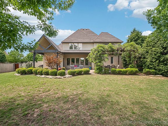 Jenks NW. Luxury Living nestled in the heart of the funnest, family friendly neighborhood behind Tulsa Hills. This corner home has the privacy of a brick wall, while still able to enjoy the view of the iconic New England Covered Bridge. A Vaulted ceiling entry welcomes your guests while designated private office is handy. Formal Dining room with convenient access to the open Living area and the walk through to Kitchen that offers a Pantry and Dry Bar space. 2 bedrooms down, 2 bedrooms plus a gameroom up. Master Suite has a dreamy view of the backyard. Newly refinished Hand-scraped wood floors add to the character of the home, while the Kitchen and Open Living add to the awe. Picture windows open for fresh air to provide a connection to the picturesque backyard that includes a stone gas firepit and Pergola that is hot-tub ready. Enjoy your music throughout the home with the Sonos system. New paint on Trim, Shutters, and Garage Doors. Features: automatic custom blinds, 70-inch TV in the living room, new roof, double oven, ice maker, tankless hot water, and a full unfinished room prepped for an extra bedroom with plumbing. 10 min to downtown. Walk to the elementary. Neighborhood fun with pool, pond, trails, covered bridge, clubhouse, courts, and playground. Quality.of.life.