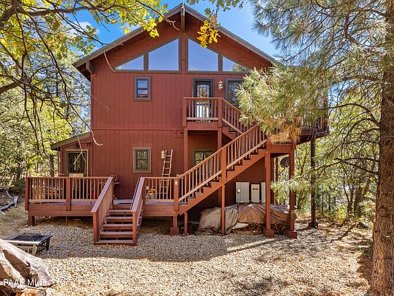 Escape the busyness of the city and live the peaceful life you've dreamed of...Welcome to a cozy well maintained 3Br/2Ba cabin 1352 sq ft. on 2 acres in the beautiful Prescott National Forest. Large windows to take in the amazing views, wrap around upstairs deck. Enjoy your morning coffee in the screened in deck while listening to the wind and birds chirping and evening meals while taking in amazing sunsets. Cuddle up in front of a wood burning fireplace in the evenings. Wood flooring, 2 car garage with a separate room above (currently being used as a sewing room/craft room/office, could be a study or man cave, possibilities only limited by your imagination). Central heat H/A and Whole house generator for pease of mind.