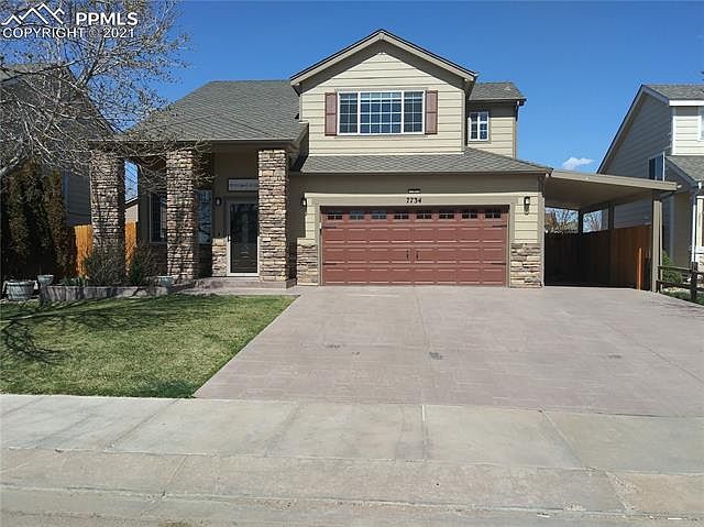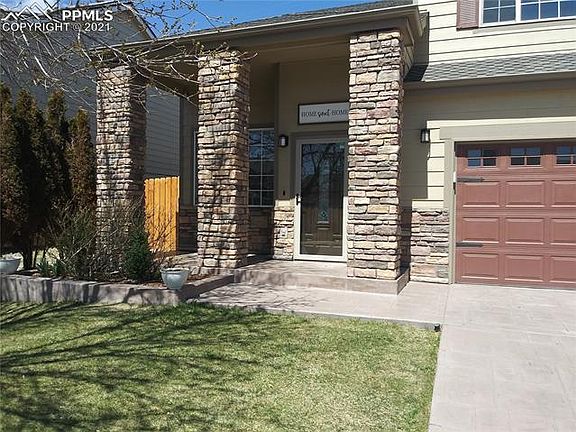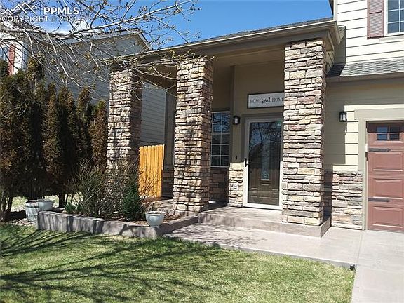 This Spectacular Fountain home is stunning and a must see! As you approach the home you are welcomed by the Stamped concrete driveway and the covered front porch with beautiful Stone Columns which displays True Pride in Home Ownership. Upon entering, you are greeted by the vaulted ceiling and wood flooring in the formal living, kitchen and dining. On the main level you will find a convenient half bath with granite counter, open concept family room with a gas fireplace, great for those cold winter months and a gorgeous eat-in kitchen with plenty of cabinet space and pantry. From the kitchen, enjoy the outdoors, this home offers a 12 X 30 covered patio with ceiling fans, privacy fencing great for entertaining family and friends for those Summer BBQ's! The upper level offers a spacious master suite, full bath with double vanity, and a walk-in closet. Upper level also features two secondary bedrooms with ceiling fans, full bath, and a laundry closet conveniently located close to each bedroom. This home also has A/C and a carport for additional parking, the interior recently painted and the home roofing is Grand Sequoia Class 4 Artisan-Crafted Shingles. The home is minutes away from Fort Carson, Parks, Schools and Shopping. Welcome Home!