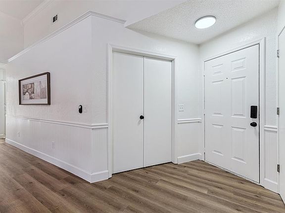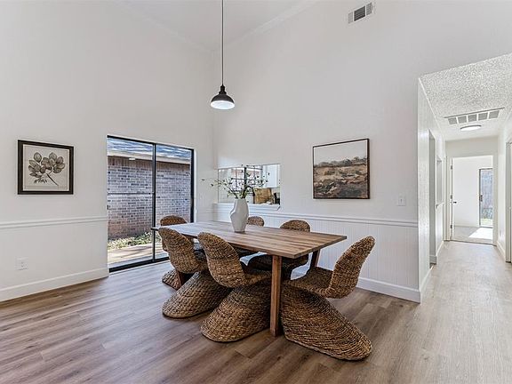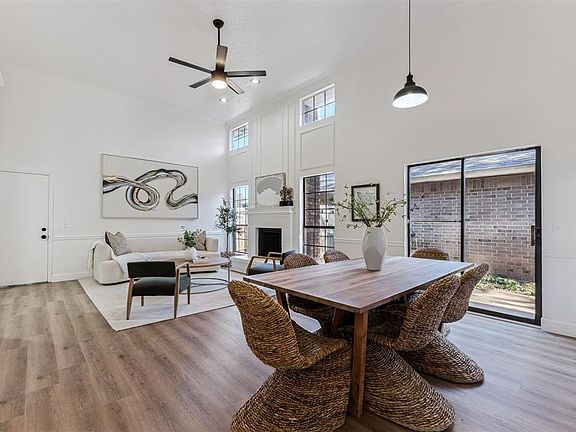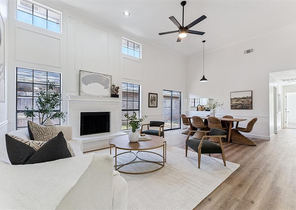 Make this bright, updated home yours! Your living area with super high ceiling, fireplace, new flooring and custom millwork makes a statement as soon as you walk through the front door. Throughout the rest of the home you'll find updates like fresh paint, new carpet in bedrooms, brand new stainless steel appliances, new tile backsplash and more. Your primary suite has a large walk-in closet as well as access to your backyard patio. Laundry room with ample storage, private and low maintenance yard. Newer HVAC and roof. Schedule your showing today! Owner licensee # 182797.