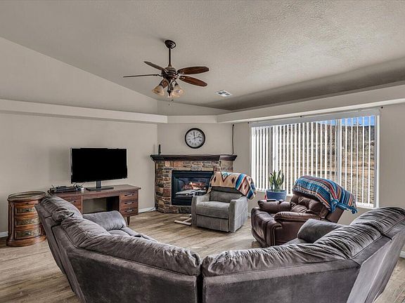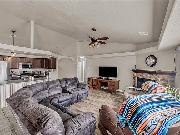 Welcome to this darling single family home, offering 3 bedrooms, 2 bathroom and located on a sprawling .93 acre lot with no HOA! This property comes with horse privileges, allowing up to 2 horses. 2-car garage, covered front patio and outdoor lighting are some nice exterior features. Inside, you'll find an open-concept layout seamlessly connecting the living room, dining area, and kitchen. The living room showcases LVP flooring and a cozy fireplace. The primary en-suite includes a walk-in shower, separate bath tub and walk-in closet. With plenty of space and thoughtful design, this home offers both functionality and charm.