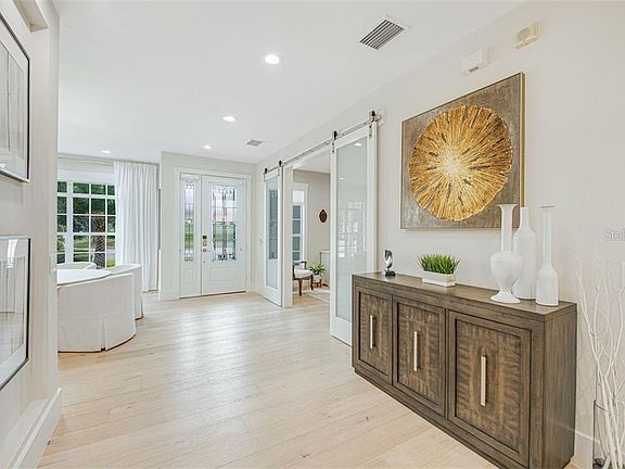 Newly renovated and professionally designed with all the elegance, sophistication, and attention-to-detail of a showcase model home, this Lakewood Ranch Country Club gem will impress even the most discerning buyers. Nestled on a private lot with mature tropical landscaping, this well-designed residence has three bedrooms plus a den, two and one-half baths, and a three-car garage. The screened-in lanai has a pergola-covered spa creating a tranquil oasis to lounge and relax. The interior of the home boasts wide plank hardwood flooring, designer lighting, accent walls, and exquisite finishes throughout. Kitchen is a showstopper with solid wood soft-close cabinetry, island with quartz countertop, designer lighting, stainless steel appliances, a 5-burner gas stove, and built-in oven/convection microwave. Dining area boasts a spectacular wine bar and generous space ideal for entertaining. Owners suite is spa-inspired with a fireplace, slider to lanai, custom organized walk-in closet, frameless shower, and soaking tub. Two additional bedrooms are spacious with custom closets. The den/office features sliding barn doors and is the perfect space to work from home. Additional features include plantation shutters, motorized shades, modern ceiling fans, 8-inch base molding, and a tiled roof. The community is gated and home is located in the Glen Eagles section of Country Club, which is maintenance-free and offers a community pool to residents. Conveniently located near world-class shopping and dining, famous beaches, great hospitals and schools.